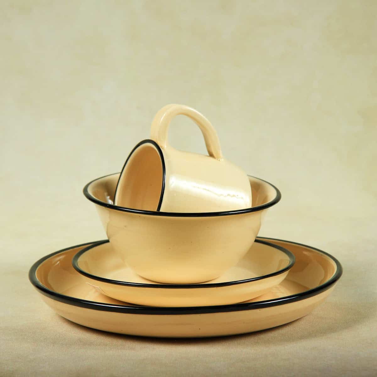 From the Diggers Collection, inspired by the gold rush heritage of Pilgrim’s Rest. This rustic tableware range echoes the look of traditional enamel campware, handcrafted in ceramic for lasting everyday use. Each piece is wheel-thrown from earthenware and finished with a transparent glaze on O-mix clay body with a signature black rim.